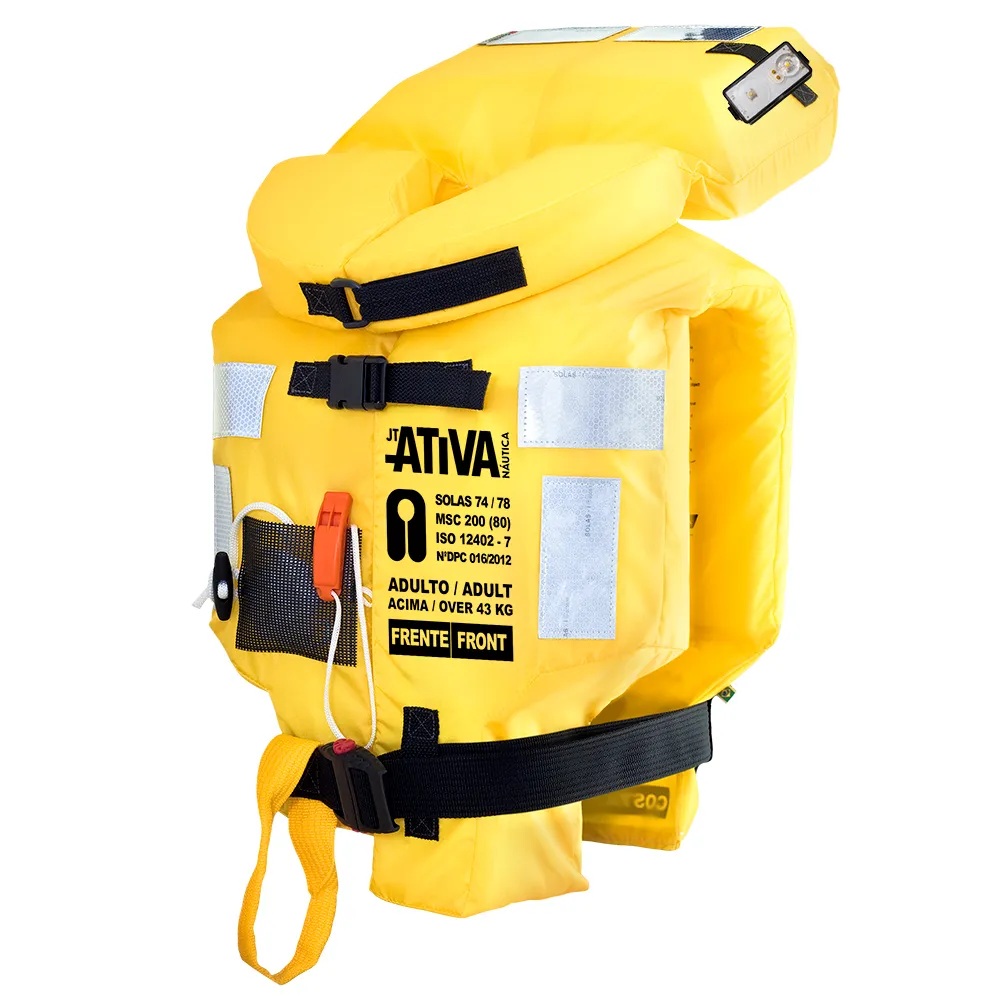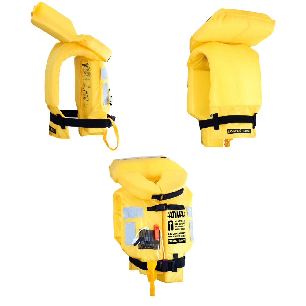 - Fechamento da gola com velcro, permite total movimentação do pescoço e cabeça em espaços estreitos como; baleeiras, balsas e escadas de acesso estreito;